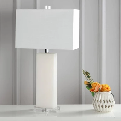 Set below a boxy linen hardback shade, this table lamp’s crisp alabaster body radiates organic elegance. An acrylic base makes for a modern finishing touch. Its simple sophistication is well suited to any room in your home. Classically geometric, this weighty alabaster lamp base adds simple sophistication to any surface. 100% cotton hardback rectangle shade. 60″ silk cord with standard USA 2-prong plug . On-off switch on socket. Takes one maximum 100 watt or equivalent bulb. Eco-friendly 9W LED bulb included. UL Listed. Before cleaning any lamp shade or fixture, disconnect the power source. Wipe with a soft, dry cloth. Avoid the use of chemicals and household cleaners as they may damage the finish.