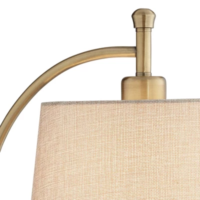 - Antique brass and black finish over metal construction. Arm adjusts side to side.