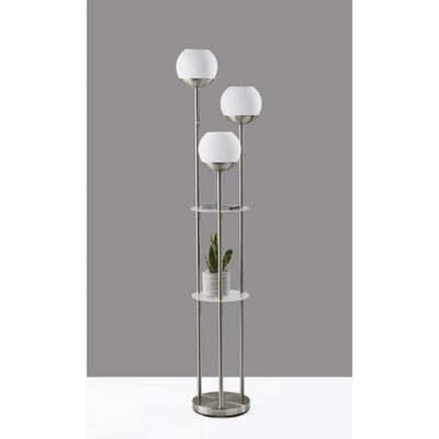 Bring a blend of style and function to your space with the 63″ Bianca floor lamp. Featuring two 10″ round frosted acrylic shelves, this lamp provides storage and display opportunities. The bottom shelf has a clearance of 34.75″, making it a perfect place to display vases, picture frames, or other taller items, while the 20″ clearance for the top shelf makes it ideal for placing drink glasses, phones, or other smaller pieces. The 10″ metal base with a brushed steel finish makes for a sturdy design, while the three brushed steel poles arranged in a triangular pattern rise cleanly to three lighting heads of varying heights for an eye-catching design. The three 7″ globe shades are made of white opal glass that complement the shelving and can be operated separately with pull chains, allowing you to control the amount of lighting. Each of the three globe shades ensconce 40W bulbs (not included), while the lamp also features a 5′ clear cord. The Bianca floor lamp is also available with an antique brass finish.