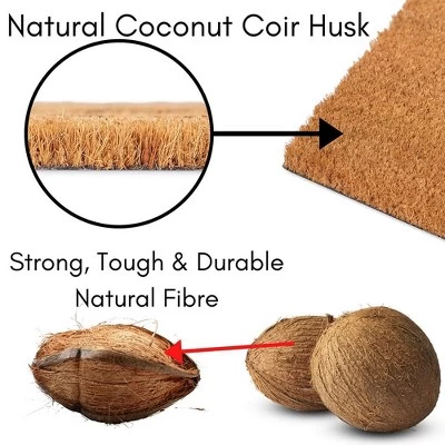 - NATURAL COIR: Made from the strong and durable husk of coconuts allowing the doormat to be resistant to saltwater, rain, and other weather elements. The back of the mat is vinyl backed, giving it adhesive grip to the floor along with making it moisture resistant.