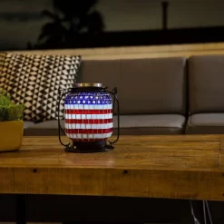 7″ Solar Patriotic Glass/Iron Hanging Lantern With LED Lights Cool White – Alpine Corporation
