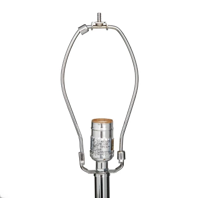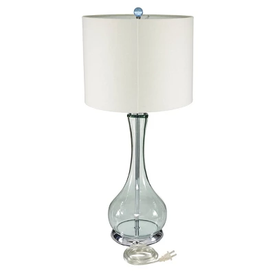 Befitting of both contemporary and traditional style, this light aqua blue glass bottle lamp features a transparent body with a subtle ocean blue hue. It’s metallic silver base and stem are neutral, along with the white drum lamp shade. The clear electrical cord keeps with the light airy feel this accent lighting brings. Designed with black rubber stoppers at the base that prevent scratching furniture and table tops, as well as sliding around. Used one standard 40-100 watt bulb (not included). This traditional table lamp has a 75″ cord. Suitable for indoor use only. This glass table lamp comes with a rectangular linen shade. Clear electrical cord and on/off switch under shade. This item comes shipped in one carton. Traditional style.