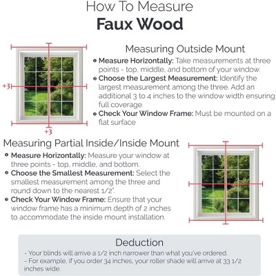 - Size Deduction – To ensure mobility within the window frame and space for the mounting brackets, our team will deduct half an inch from the width ordered. (For example, if you order 34 inches, your blinds will arrive exactly 33 1/2 inches wide).