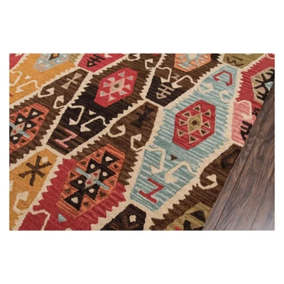 The graphic global designs of this traditional area rug are reminiscent of roads less travelled. Intricate Kazak rug motifs, including geometric patterns and repeating floral fields, are depicted in desert-inspired shades of warm red, gold, burnt sienna and sky blue. Natural 100% wool fibers and hand-tufted construction reflect the rugged sensibilities of each rug’s nomadic design, while a washed finish gives the rustic rug a refined hand.