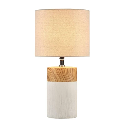Elevate your decor and illuminate your home with the contemporary style of the 510 Design Nicolo Textured Ceramic Table Lamp. This round table lamp features a two-tone ceramic base in white with a brown wood grain pattern to create a stunning modern look. The drum lamp shade softly filters the light to provide a warm ambiance in your space. Flaunting a simple, yet gorgeous design, this modern table lamp adds a sophisticated charm to your home decor. Handle with care. Spot clean only.