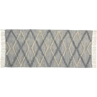 Refresh your decor with this soft and subtle accent rug in today’s modern neutrals. A soothing light grey and ivory weave brings an accent of texture and harmony into your room. Fringe finish completes its soft appeal! Perfect for your contemporary, eclectic or bohemian decor, in a light and airy open-diamond pattern. The cotton-polyester-rayon blend is spot cleanable. Great for the Kitchen