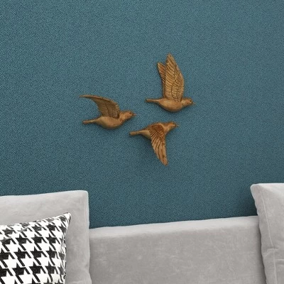 - •Detailed carved bird figurines depicting 3 various flight movements, metallic gold finish throughout each bird wall decor sculpture