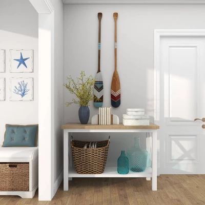 Use this nautical oar wall decor set as a two-piece leaning-against-the-wall floor standee, or as separate corner ornaments. This item ships in 1 carton. Wood wall decor makes a great gift for any occasion. Can be hung horizontally or vertically using a hanging hooks; hook, nails and screws not included. Suitable for indoor use only. This item ships fully assembled in one piece. This multi colored wall sculptures comes as a set of 2. Coastal style.