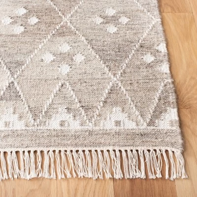 - Flat weave rug style, fringe details