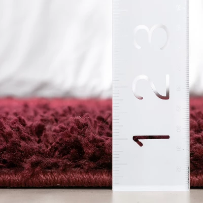 - Textured, shaggy pile woven in a rich red color.