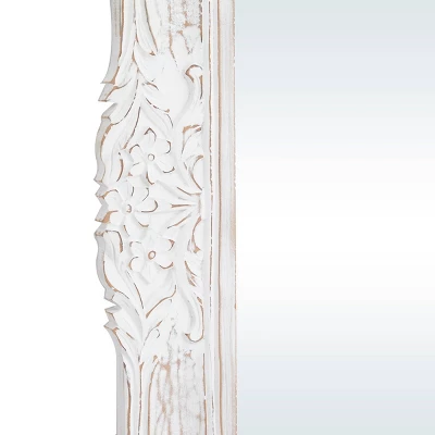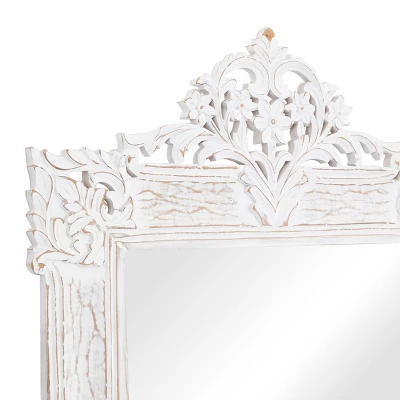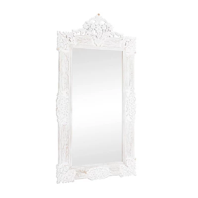 Add some style to your home with this decorative wall mirror that can bounce back light and make any room look bigger. This item ships in 1 carton. Can be hung vertically using the D-rings on the back; nails and screws not included. Suitable for indoor use only. This item ships fully assembled in one piece. Made in India. This is a single white colored entryway mirror. French Country style.